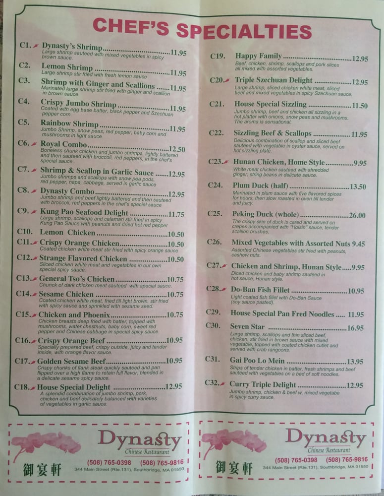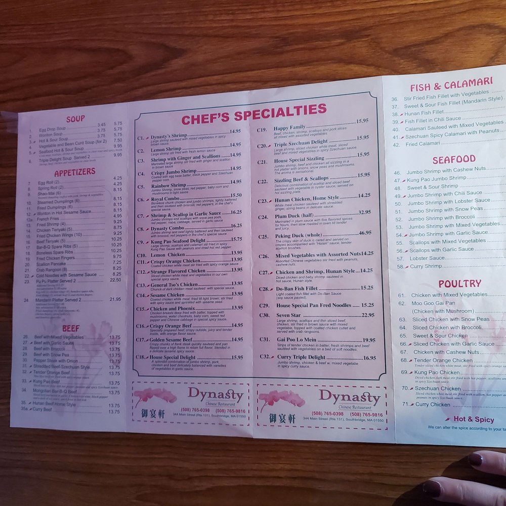 Are you in search of exceptional Chinese cuisine in Southbridge, MA? Look no further than Dynasty Chinese Restaurant! Located at 344 Main St, Dynasty offers a unique blend of casual yet classy atmosphere with attentive staff and quick delivery services. With rave reviews from customers like Kenneth M., Nora M., Tracey B., Poppy S., Ed Y., and Bart M., you can trust that Dynasty delivers on both taste and service. Whether you're craving classic dishes like beef with broccoli and general TSO chicken or looking for a quick and satisfying rice plate, Dynasty has you covered. Don't hesitate to experience the artistry of flavor at Dynasty Chinese Restaurant today!